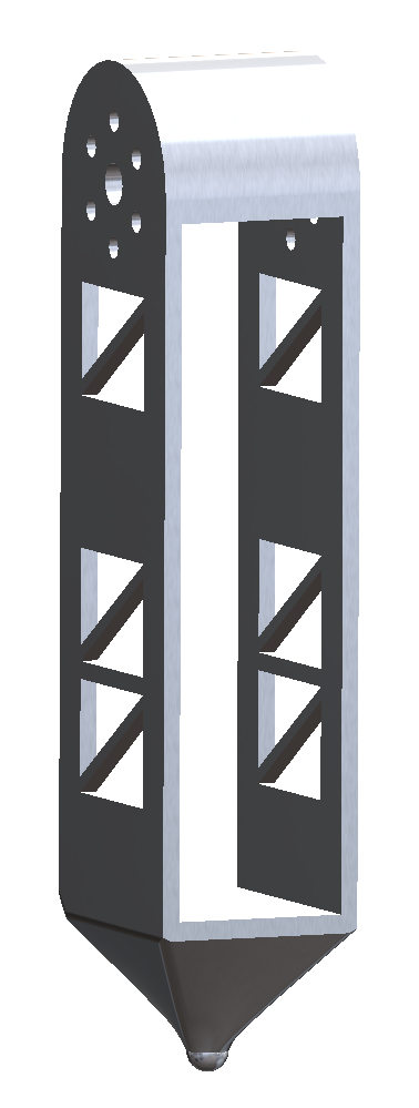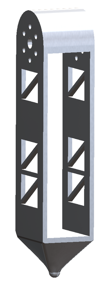 This piece is the "shank" of a four-legged walking/running robot, designed to connect the femur to the motor hub. Design and modeled in SolidWorks.