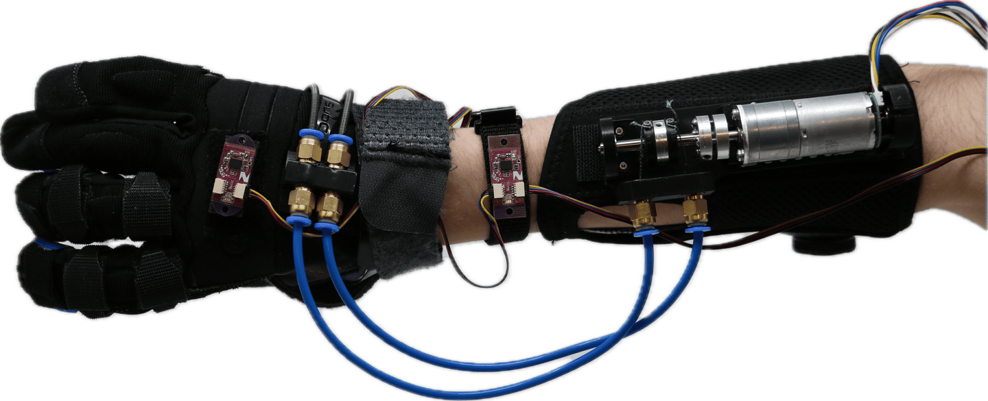 While this might seem like it would reduce the moment arm (and thus torque), the design intent was to increase effective grasping force by minimizing slack introduced by glove material compression and improving the transmission of tensile force from the motor to the fingertips.