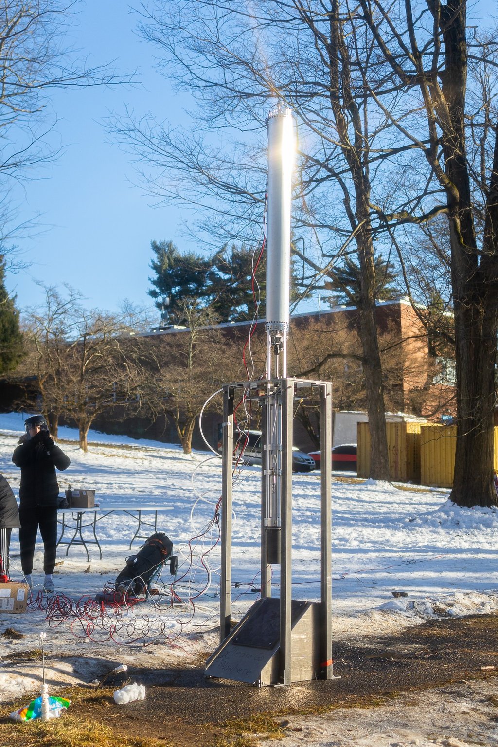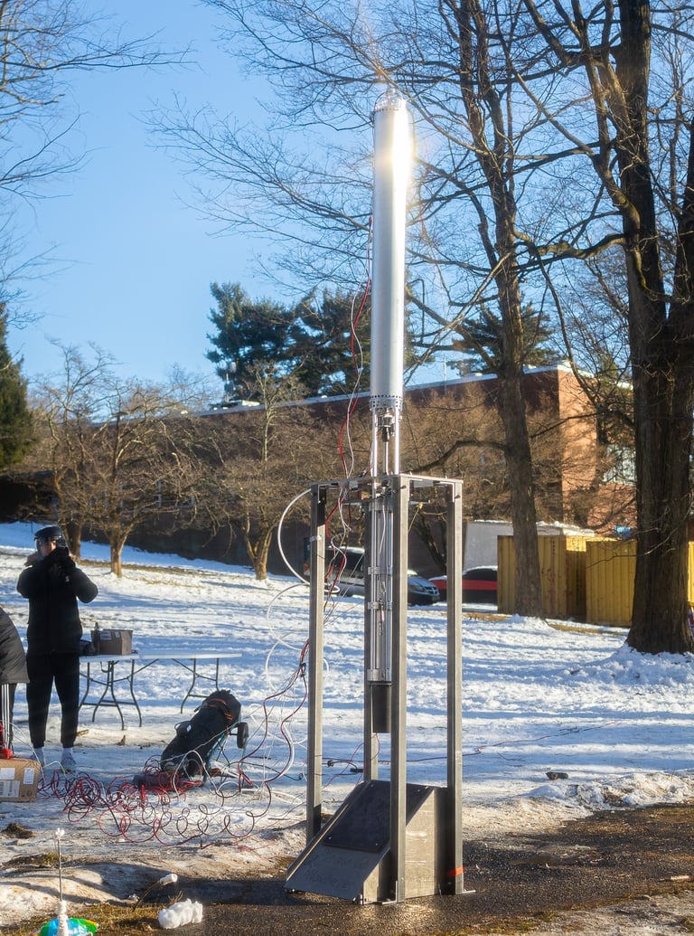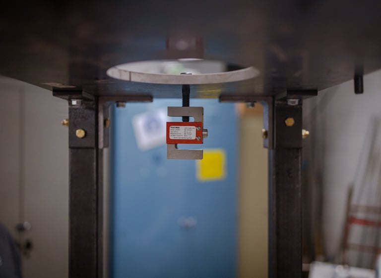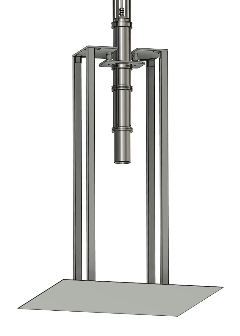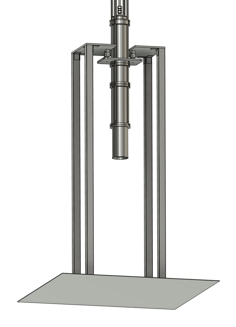 Our Test Stand is made out of four 6-foot tall low carbon steel rectangular tubes. They are connected by 316 stainless steel brackets to a 1-inch steel top plate and are anchored to the ground.